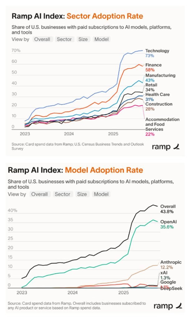 Mas o dado mais duro do relatório está nas planilhas, não nos laboratórios. Nos EUA, praticamente 44% das empresas já pagam por IA, ante 5% em janeiro de 2023. O contrato médio é de US$ 530 mil por ano, e as startups “AI-first” crescem 1,5× mais rápido do que seus pares. A IA, enfim, virou linha orçamentária, não mais protótipo de P&D.