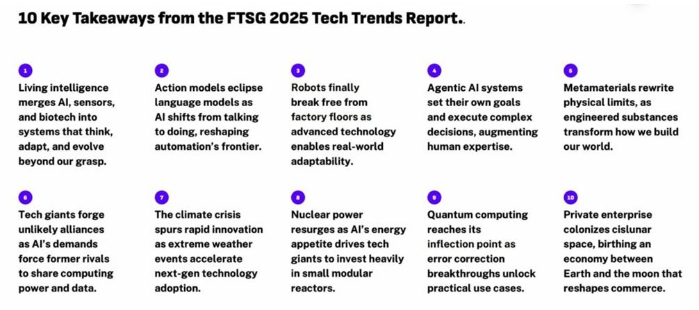 Amy Webb retomou o conceito da Living Intelligence, que tinha adiantado em dezembro de 2024, sinalizando que a convergência da IA, sensores e Bioengenharia está abrindo caminho para a era da “Inteligência Viva”, com um foco importante nos saltos de inovação que as Ciências Biológicas darão com o uso da IA como fundação.