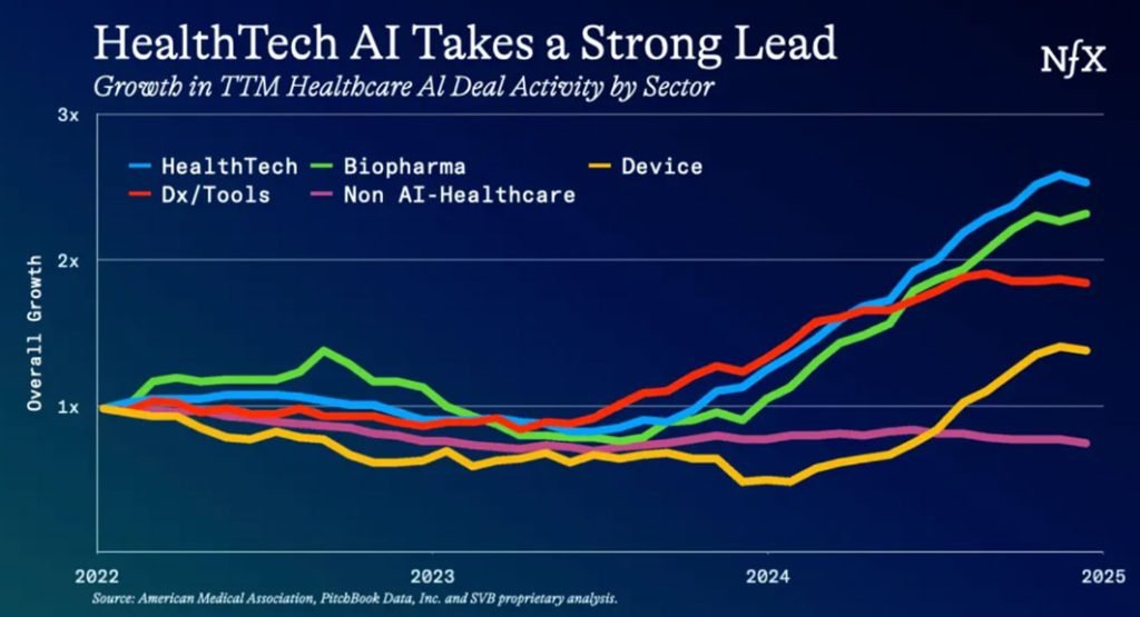 capital tradicional da área da saúde é limitado e o financiamento de subsídios é instável. No entanto, a IA trouxe um novo conjunto de investidores para a mesa, segundo Drory, quando o foco é ampliado para onde a demanda está crescendo: saúde e IA em tecnologia da saúde, diagnósticos/ferramentas e biofarmacêutica. Aí o fluxo de negócios parece muito diferente e muito ativo.