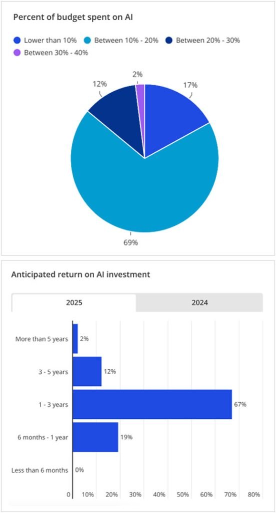 - CapEx e OpEx de IA: 69% dos CEOs planejam alocar 10%-20% do orçamento em Inteligência Artificial nos próximos 12 meses. A expectativa de retorno encurtou para 1-3 anos em boa parte dos casos. Isso empurra as organizações a deixar de lado pilotos dispersos e montar plataformas e agentes reutilizáveis.