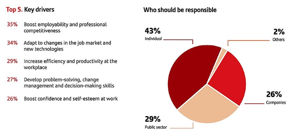 Em relação aos jovens que ainda vão ingressar no mercado de trabalho, 69% dos brasileiros acreditam que ficará cada vez mais difícil. E em relação a ampliar a empregabilidade dos profissionais, a maior responsabilidade é individual (43%), seguida do setor público (29%) e depois pelas organizações (26%). A maior barreira que se coloca entre brasileiros e o aprendizado contínuo continua sendo o custo (48%). O tempo (27%) tem um peso menor, assim como as restrições de orçamento das empresas (21%).
