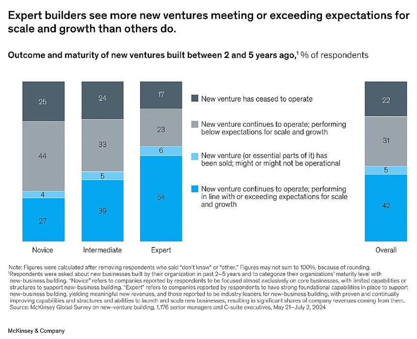 No modelo “venture factory”, as organizações colocam de pé estruturas internas dedicadas à criação, incubação e escalabilidade de novos negócios. Empresas que dominam esse modelo são duas vezes mais propensas a obter sucesso e, em média, geram 12 vezes mais receita no quinto ano de operação de um novo negócio, se comparadas a empresas iniciantes. A grande maioria (90%) dos investidores defendem que as empresas aumentem ou, no mínimo, mantenham seus investimentos nessa frente, segundo um levantamento da McKinsey. Essas iniciativas devem responder por mais da metade do crescimento das empresas nos próximos anos.