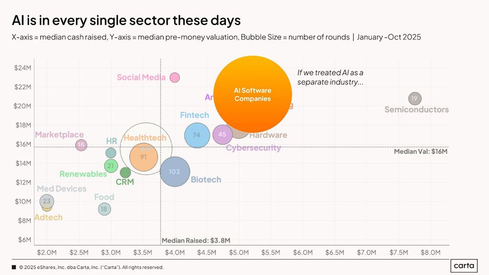 Outro diferencial: a IA está presente em praticamente todas as verticais de negócio, de biotechs a SaaS, o que causa uma certa “democratização” do acesso ao capital, e consolida a ideia de que a IA é uma tecnologia transformadora de uso geral. Nas rodadas seed, por exemplo, quem tinha a palavra mágica no seu pitch deck ficou com uma parte do dinheiro de 2025 (gráfico abaixo). Nessas negociações, a regra foi: valuation mais alto, mais dinheiro entrando e menos rodadas.