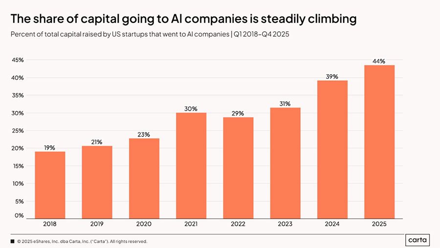 As startups de IA capturaram 44% de todo o capital inicial investido em startups nos EUA em 2025, alcançando avaliações recordes para as empresas envolvidas (gráfico abaixo).