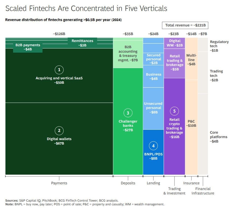 A projeção é que, em sua jornada de crescimento e amadurecimento, essas grandes fintechs irão atuar como empresas de capital aberto maduras. Elas estão divididas em cinco verticais, em que Pagamentos respondeu por US$ 126 bilhões em receitas das fintechs em escala em 2024 (com carteira digitais ficando com uma fatia de US$ 67 bilhões, e Adquirência de Comerciantes e SaaS Vertical, com US$ 50 bilhões (veja o gráfico).